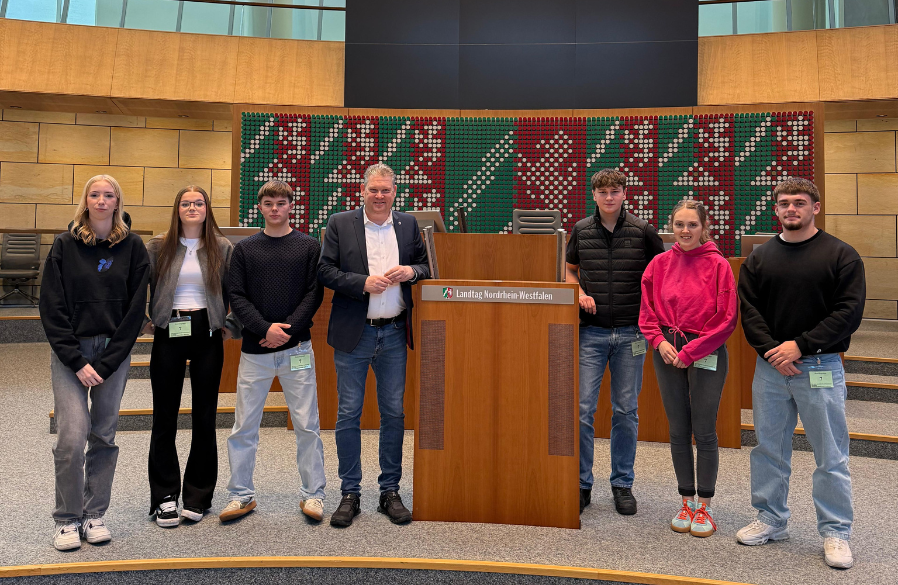Die politische Arbeit im Landtag hautnah miterleben und dabei mit dem zuständigen Abgeordneten über die Belange der Heimat diskutieren – dazu hatten in den vergangenen Wochen die Mitglieder der Jungen Union Rüthen die Gelegenheit. Der heimische CDU-Landtagsabgeordnete Jörg Blöming empfing die Gruppe persönlich in Sitzungsräumen im Landtag und sogar Landtagspräsident André Kuper kam spontan zu einem kurzen Gespräch dazu und berichtete über seine umfangreichen Tätigkeiten im Landtag. Zuvor durften die Besucherinnen und Besucher bereits im Rahmen einer Führung die Räumlichkeiten sowie die Geschichte des Landtags entdecken. Highlight war der Besuch des Plenarsaals, in dem regelmäßig die großen Debatten des Landtags stattfinden.